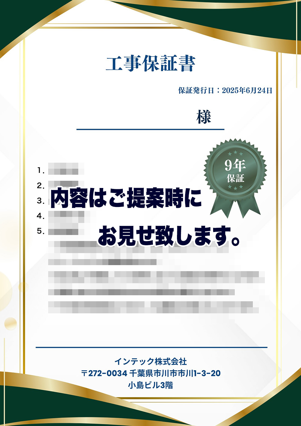 弊社では、リフォーム工事をご依頼いただいた全てのお客様に、正式な保証書を発行しております。