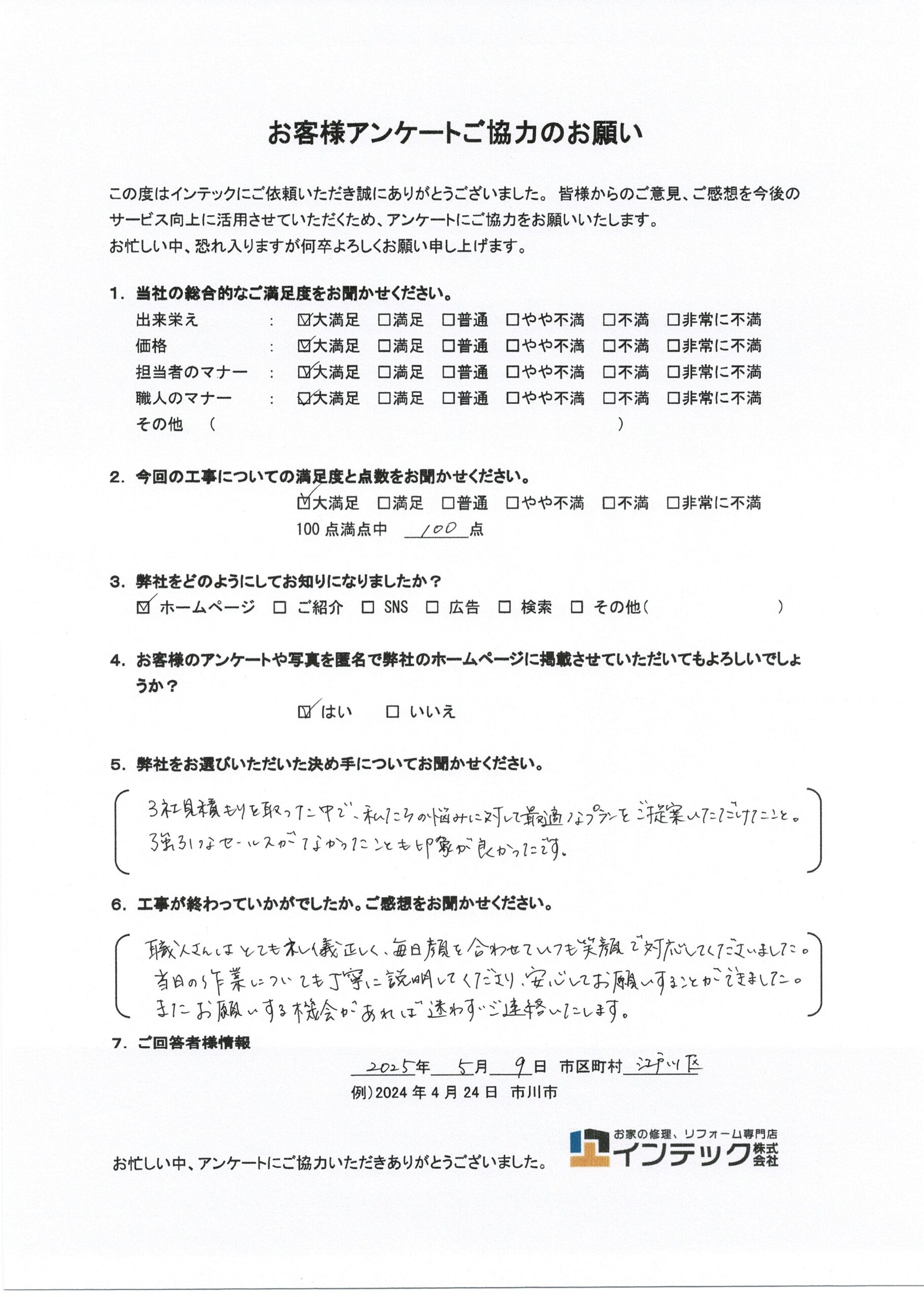 職人の毎日のご挨拶や丁寧な作業説明についてもお褒めいただき、現場スタッフも喜んでおります。「また機会がありましたらお願いいたします」とおっしゃっていただけたことが、私たちにとって一番嬉しいお言葉です。