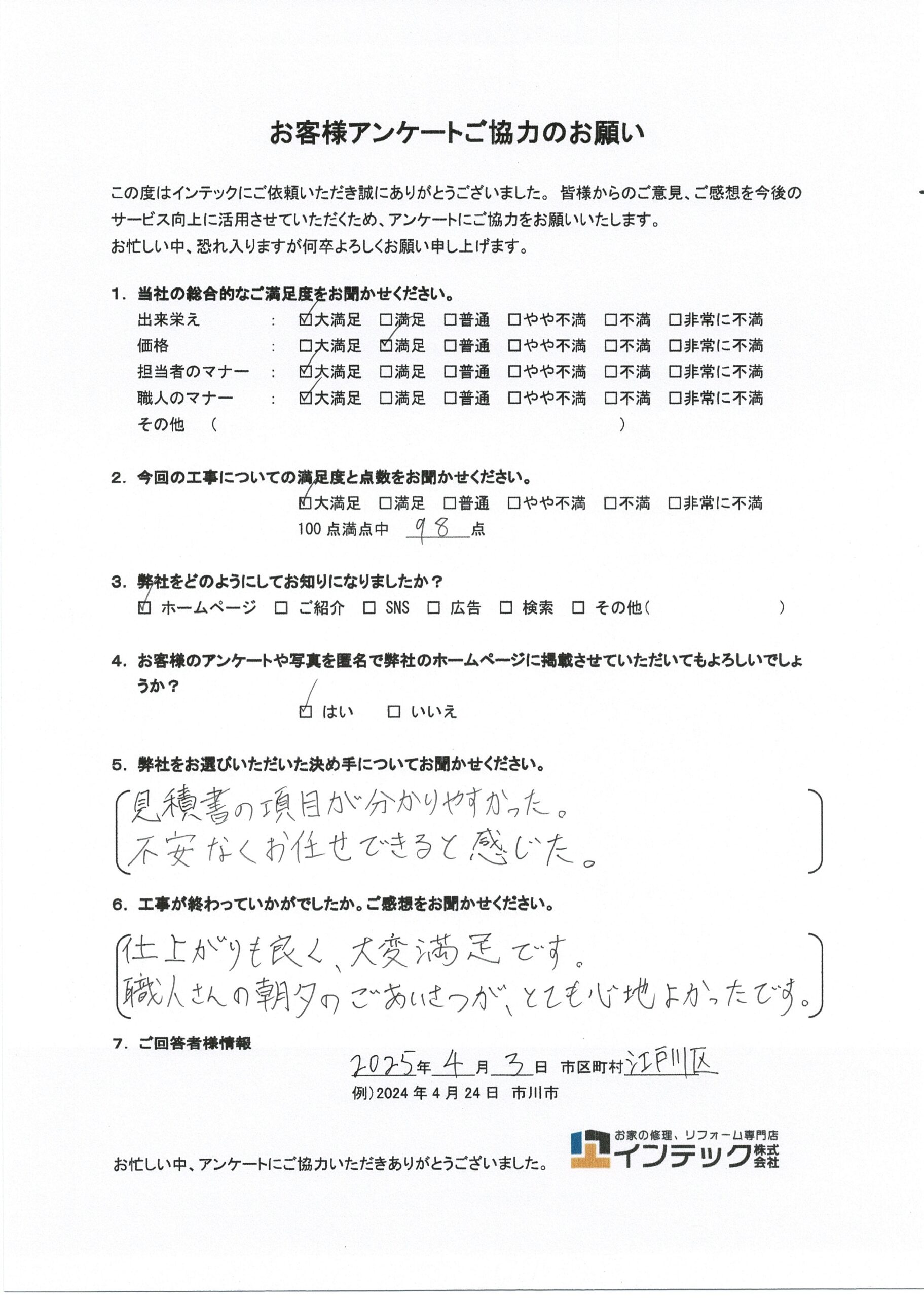 「見積書の項目が分かりやすかった。不安なくお任せできると感じた」とのお言葉をいただき、私どもが心がけている分かりやすいご説明が伝わったこと、大変嬉しく思います。